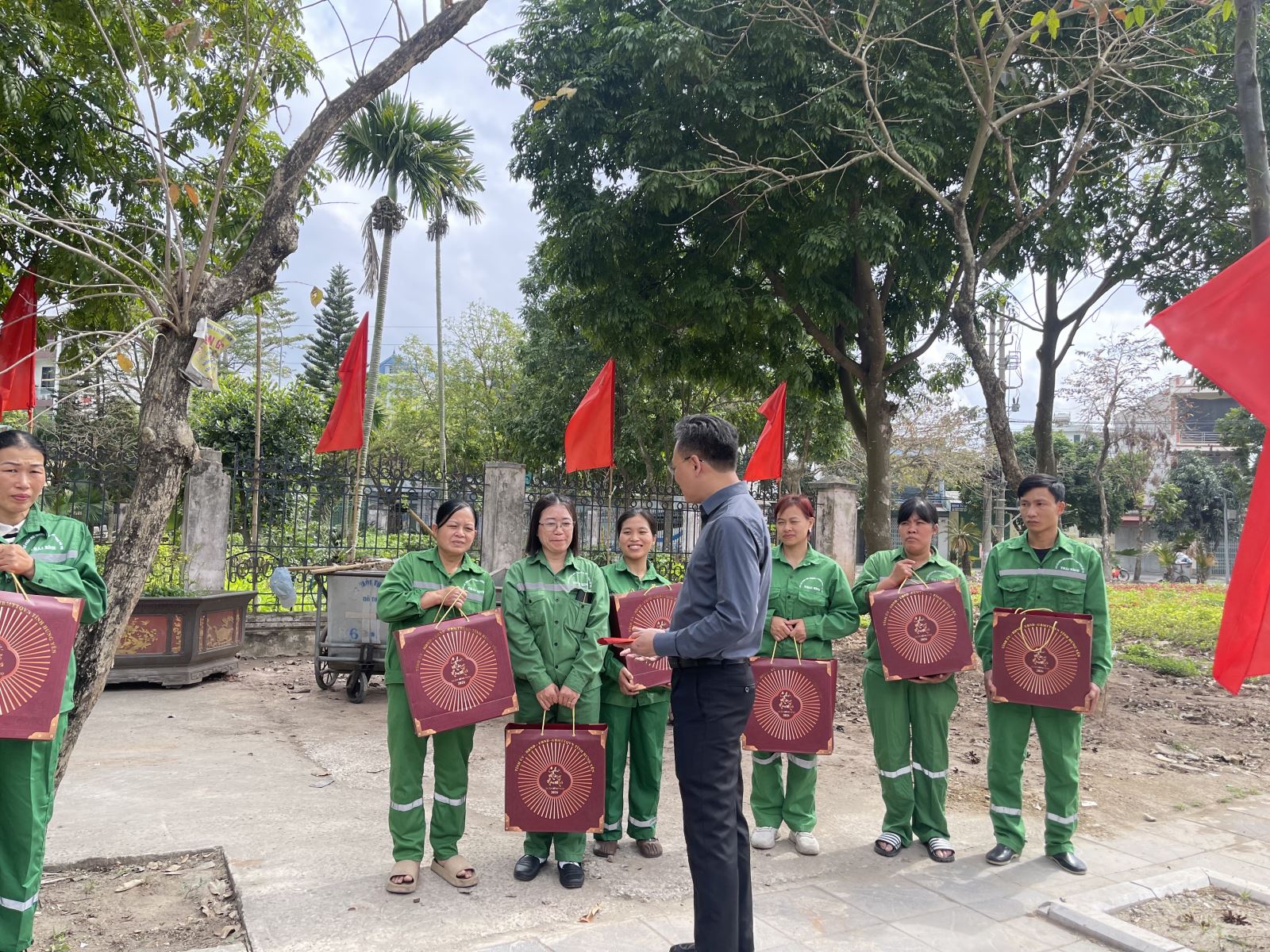 (Đồng chí Nguyễn Hữu Nghĩa - Ủy viên Ban Chấp hành Trung ương Đảng, Bí thư Tỉnh ủy cùng các đồng chí lãnh đạo tỉnh tặng quà Tết động viên công nhân Công ty Cổ phần Môi trường và Công trình đô thị Thái Bình đang thực hiện nhiệm vụ trong những ngày Tết)